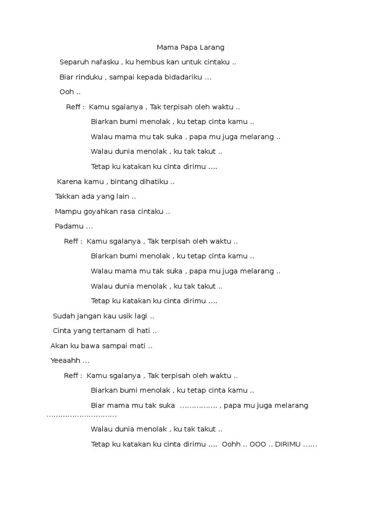 A ku tetap cinta kamu. Dm g c f biar mamamu tak suka…papamu juga . Kamu segalanya, tak terpisah oleh waktu. Biarkan bumi menolak, ku tetap cinta kamu Biar mama mu tak suka, . Lagu mellow nih :) ✡✡✡ selamat bernyanyi ✡✡✡ separuh nafasku. Kamu segalanya, tak terpisah oleh waktu Biarkan bumi menolak, ku tetap cinta kamu. Kamu segalanya, tak terpisah oleh waktu Dm e biarkan bumi menolak. Kamu segalanya, tak terpisah oleh waktu. 'mama papa larang' adalah salah satu lagu legit dari judika. Kamu segalanya, tak terpisah oleh waktu.